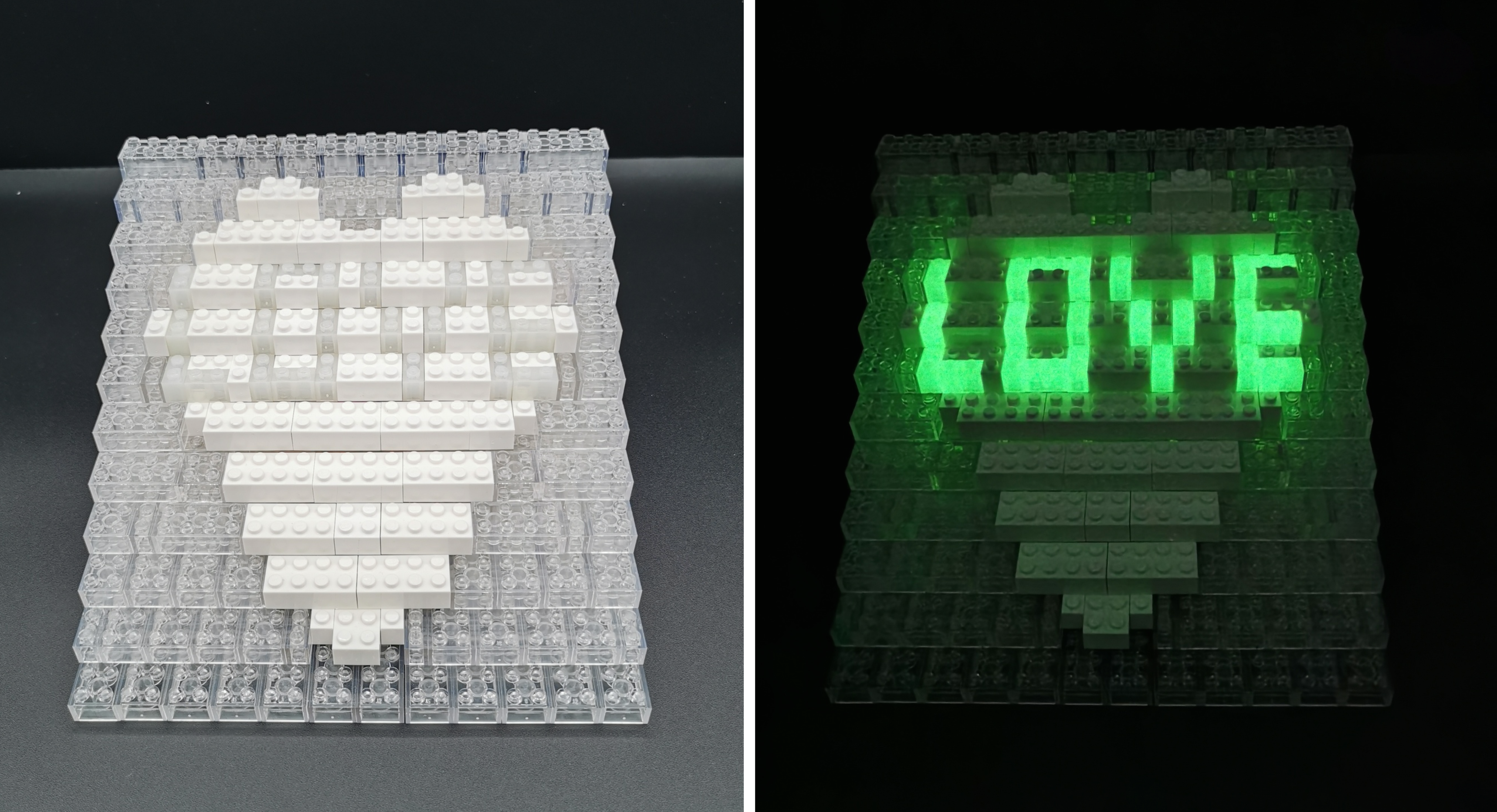 In this work, we have explored for the first time the possibilities offered by the use of fluorescent bricks, which during the day appear slightly more opaque compared to white bricks but glow in the darkness. The Love Ladder is therefore doubly innovative, as not only does the message change depending on the perspective from which it is observed – only a frontal observation highlights the presence of the universal symbol of love – but in this case, light plays a fundamental role. In the absence of illumination, the word 'LOVE' shines in the dark, guiding the observer like a beacon in the middle of the sea.
